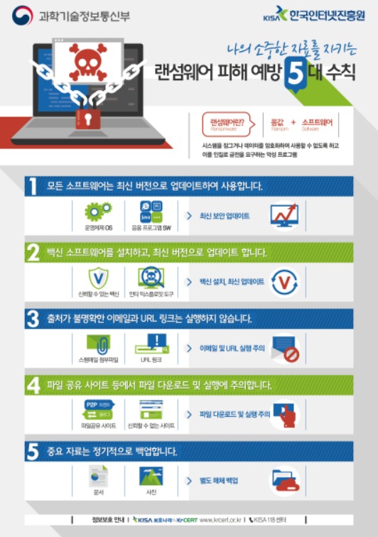 과기정통부는 랜섬웨어 피해 예방을 위해 ▲최신 버전 소프트웨어 사용 및 보안 업데이트 적용 ▲출처가 불명확한 이메일과 URL 링크 클릭 주의 ▲파일 공유 사이트 등에서 파일 다운로드 주의 ▲중요한 자료의 정기적 백업 등을 권고했다.