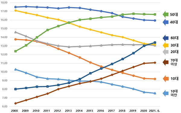 행정안전부는 6일 우리나라 주민등록 연령별 인구 통계를 발표, 2008년부터 40대 이하는 비중이 큰 폭으로 감소하고 있는데 반해 50대 이상은 큰 폭으로 증가하고 있다고 설명했다.