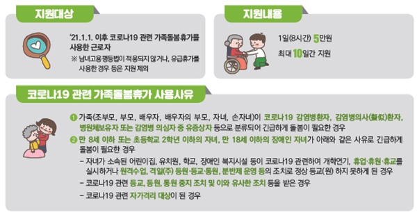 이에 따라 1일 5만원을 근로자 1인당 최대 10일동안 지원하는데, 가족돌봄휴가가 무급인 점을 고려해 코로나19 관련 가족돌봄휴가를 사용한 근로자에게 최대 50만원을 지원해 휴가사용 촉진 및 경제적 부담 완화를 도모하고 있다.