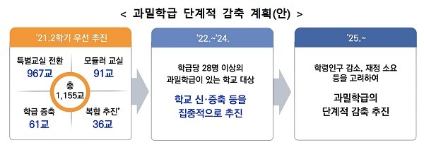 우선 학급당 학생 수 28명 이상인 과밀학급(상위 약 20% 수준)을 적극적으로 해소하고 향후 시도교육청과 적극 협력해 단계적 감축을 추진하고 학교 신·증축 재정지원 확대(276억 원), 투자심사 등 기준 개선, 학교용지법 개정, 중장기 교원수급 모델 마련 등을 추진한다.
