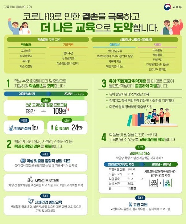 이번 교육회복 종합방안은 국가·지방정부가 협력해 학생결손이 누적되지 않도록 올해 하반기부터 즉시 추진한다.