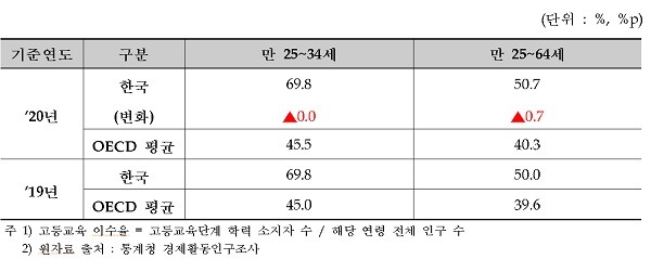 2020년 우리나라 성인(만 25∼64세)의 고등교육 이수율은 50.7%로 OECD 평균보다 높았고, 특히 청년층(만 25∼34세)은 69.8%로 OECD 국가 중 1위를 차지했다.