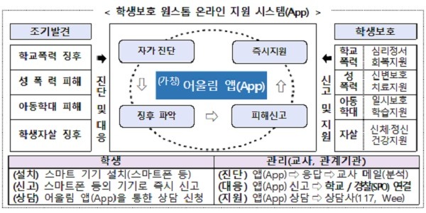 학생이 온·오프라인 학교폭력과 아동학대, 성폭력 등에 노출되면 즉시 감지해 지원(신고·대응)하는 전방위적 학생보호 원스톱 온라인 시스템(가칭 ‘어울림 앱’)을 구축한다.