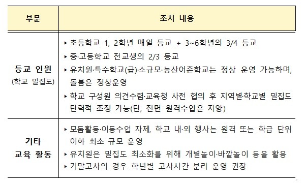 초등학교는 1·2학년을 포함한 밀집도 6분의 5, 중·고등학교는 밀집도 3분의 2로 한다. 유치원·특수학교(급)·소규모·농산어촌 학교는 특성을 고려해 정상 운영 가능하며, 돌봄은 정상 운영한다.