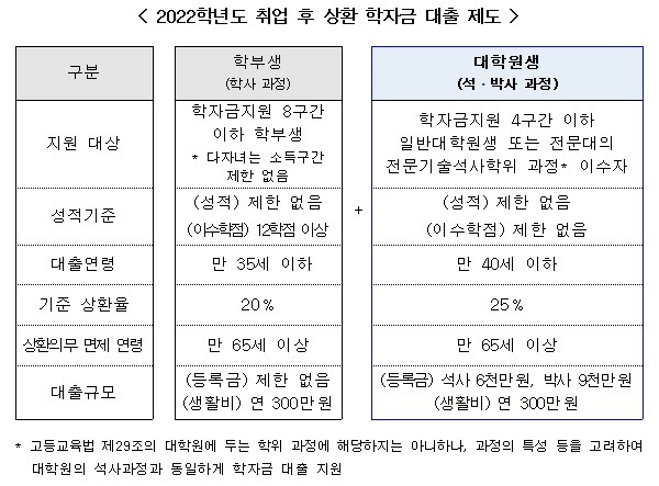 아울러 취업 후 상환 학자금대출의 지원대상 범위를 늘린다. 학자금지원 4구간 이하 일반대학원의 석·박사 과정 또는 전문대의 전문기술석사학위 과정을 이수중인 자까지 확대한다. 다만, 대학원생은 성적 및 이수학점 요건을 미적용한다.