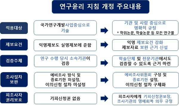 또 그간 제보자에게만 부여했던 기피신청권을 피조사자에게도 부여하고, 연구 부정 의혹이 사실이 아닌 것으로 밝혀질 경우 피조사자의 명예회복을 위해 노력하도록 조사기관에 의무를 부과해 피조사자의 권리보호 장치를 명시했다.
