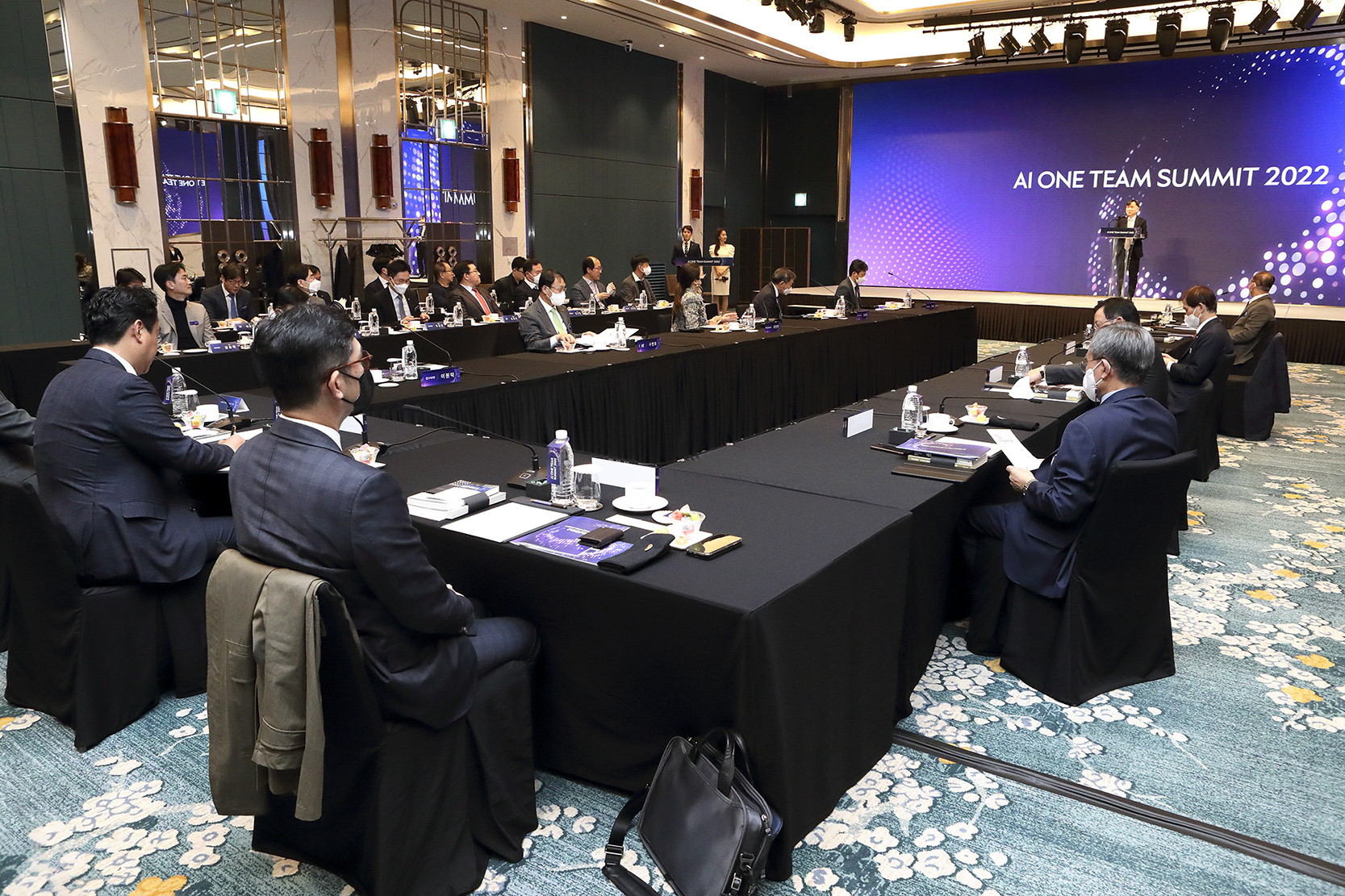KT가 25일 오후 소피텔 앰배서더 서울에서 ‘AI 원팀 서밋(AI One Team Summit) 2022’를 개최하고, 참여 기관들이 함께 대한민국 AI의 미래 방향성을 논의했다고 26일 밝혔다.