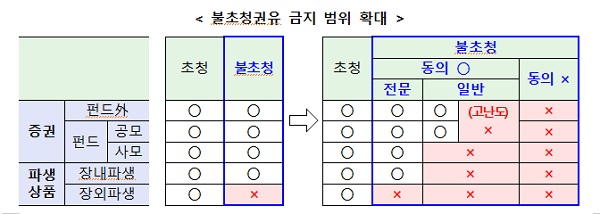 지금까지 금융소비자보호법은 원칙적으로 소비자 요청이 없는 경우 방문판매를 통한 투자성상품 권유를 금지하고 있으나(일명 불초청권유 금지) 시행령에서 넓은 예외를 인정함에 따라 장외파생상품을 제외한 모든 투자성 상품에 대해 사실상 불초청권유가 가능했다.