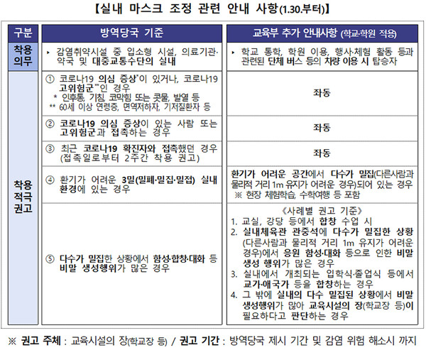 교육부는 예외적으로 착용 의무 유지 또는 적극 권고가 필요한 상황을 쉽게 이해할 수 있도록 각급 학교·학원에서 적용할 세부기준을 마련해 27일 배포했다.