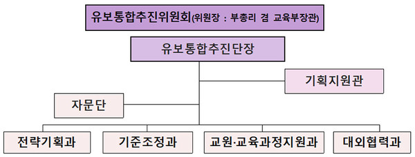 또 유아교육과 보육 분야의 전문가 등으로 자문단이 구성돼 4개 내외의 분과위원회 형태로 운영된다. 자문단은 유보통합추진단의 업무 추진 과정에서 교원 자격·양성체제 개편, 표준보육과정-누리과정 연계, 유보통합 재원 확보 방안, 통합 모델 방향 등 핵심적인 과제들에 대한 자문을 지원한다.