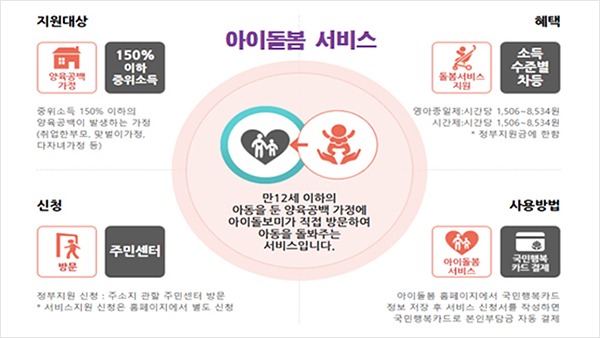 아이돌봄 서비스는 부모의 맞벌이 등으로 양육 공백이 발생한 가정의 만 12세 이하 아동을 대상으로 아이돌보미가 집으로 찾아가 돌봄 서비스를 제공하는 사업이다.