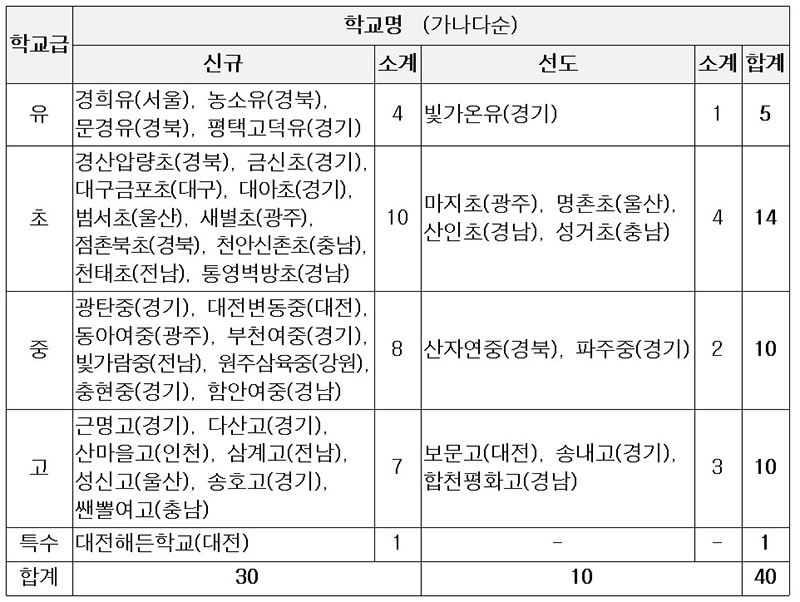 이번 중점학교에는 신규로 30개교를 선정하고, 학교 탄소중립 교육의 전문성을 제고하기 위해 기존에 중점학교로 선정되었던 학교를 중심으로 선도모델 유형 10개교를 선정했다.