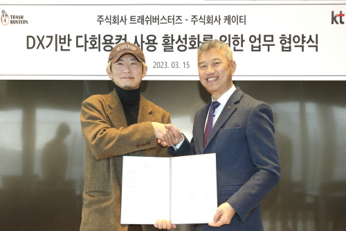 KT와 일회용품 대체 서비스 기업 트래쉬버스터즈가 다회용컵 활성화와 '다회용컵 무인 회수 솔루션' 개발에 협력하기로 했다고 16일 밝혔다.