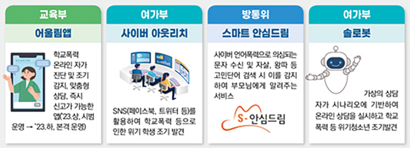 SNS 등으로 사이버폭력을 감지하는 어울림앱(교육부), 사이버 아웃리치(여가부), 스마트 안심드림(방통위), 솔로봇(여가부) 등을 홍보하고 학생들의 활용도를 높여 피해 의심 학생을 조기에 감지한다.