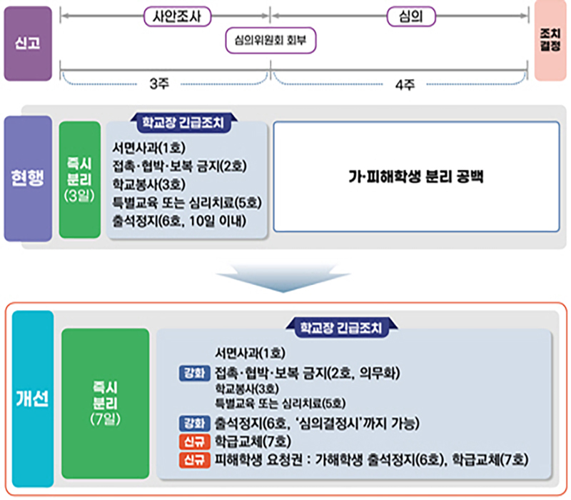 학교폭력이 발생하면 학교장은 가·피해학생을 즉시분리하는데, 현행 3일로는 휴일이 포함된 경우 실효성이 낮아 기간을 7일 이내로 연장한다.