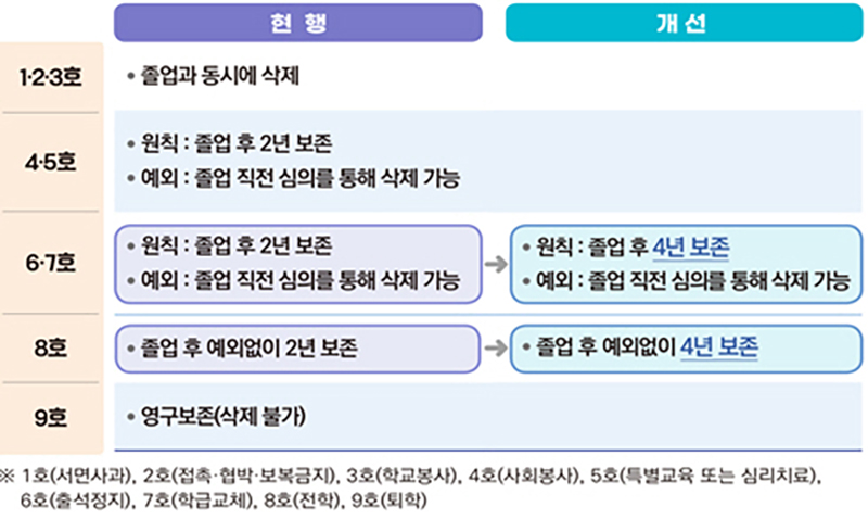 현재 보존기간이 만료되지 않아도 졸업 직전 심의를 통해 삭제할 수 있는 사회봉사(4호), 특별교육(5호), 출석정지(6호), 학급교체(7호) 조치의 심의요건도 강화한다.
