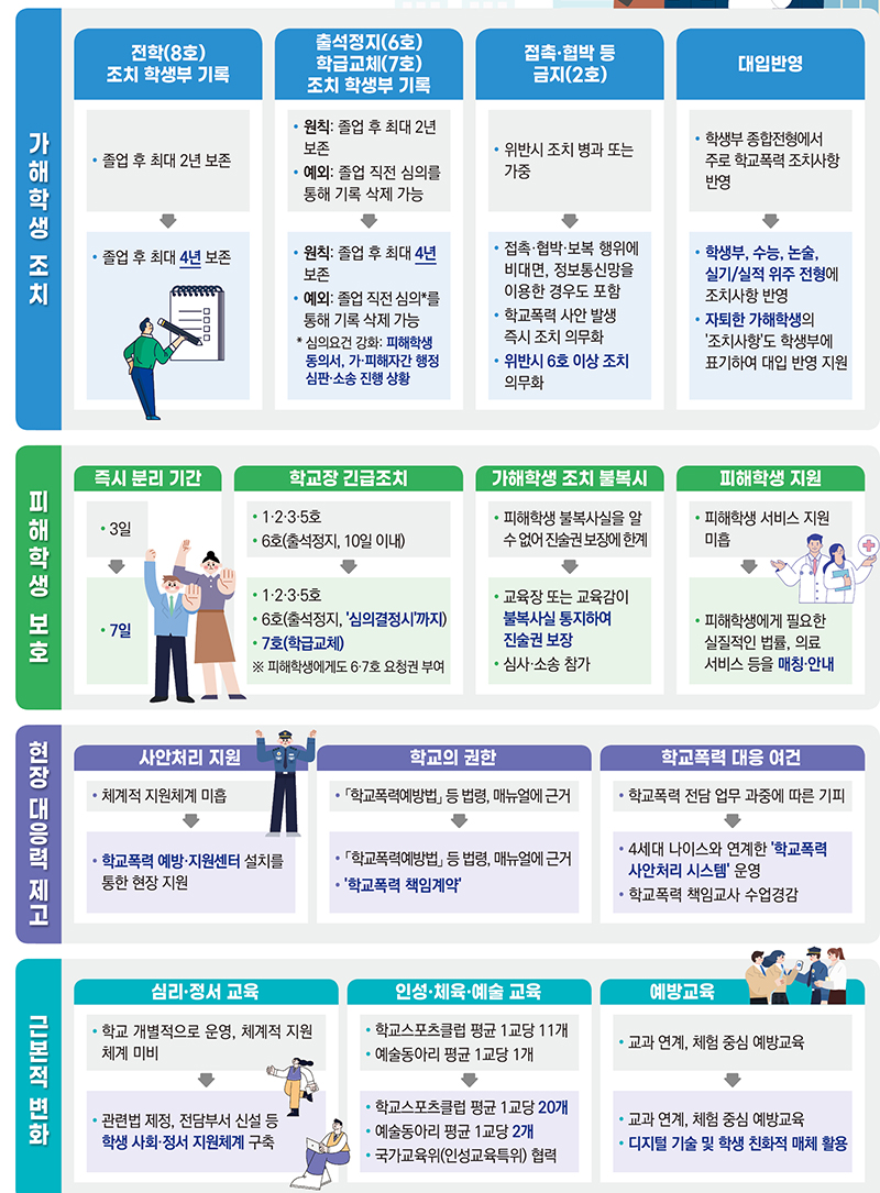 이를 위해 중대한 학교폭력을 일으킨 가해학생에게 내려지는 출석정지(6호), 학급교체(7호), 전학(8호)의 학생부 기록 보존기간을 졸업 후 2년에서 4년으로 연장해 ‘학교폭력 때 대학 입학뿐만 아니라 졸업 때까지도 불이익을 받는다’는 경각심을 강화한다.