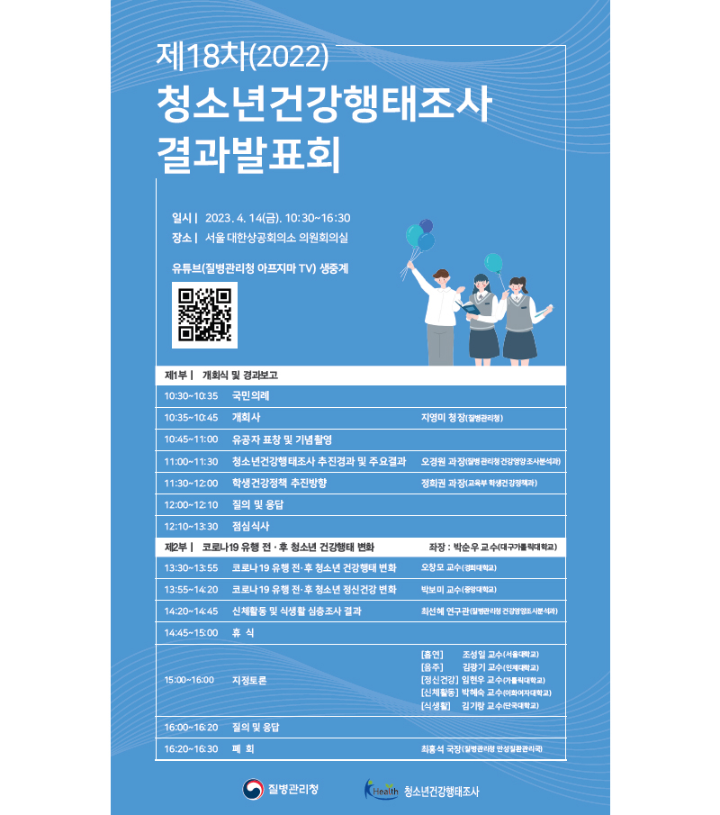 지영미 질병청장은 “코로나19 유행 3년 차를 맞은 지난해는 단계적 일상을 회복해 온 해로, 조사 결과에서도 확인됐듯 청소년의 음주, 신체활동 등 건강행태 변화가 있었다”며 “청소년건강행태조사 결과 발표회에서 관계분야 전문가와 함께 심도 있는 논의를 통해 주요 건강 행태에 대한 개선방안을 모색해 나가겠다”고 밝혔다.