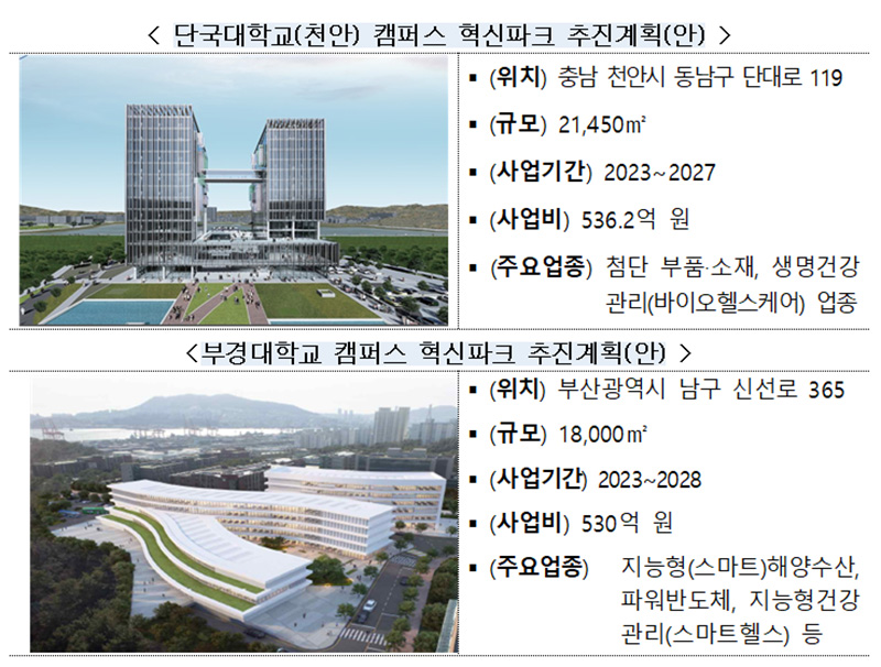 교육부, 국토교통부, 중소벤처기업부는 단국대 천안캠퍼스와 부경대를 2023년 캠퍼스 혁신파크 신규 후보지로 최종 선정한다고 18일 밝혔다.