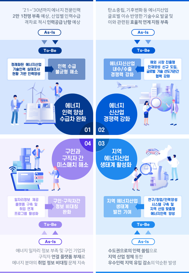 정부는 탄소중립, 에너지 안보 등 글로벌 에너지 패러다임에 대응하고 에너지신산업을 신성장동력으로 육성하기 위해 ‘에너지인력양성 중장기 전략’을 수립해 추진한다.