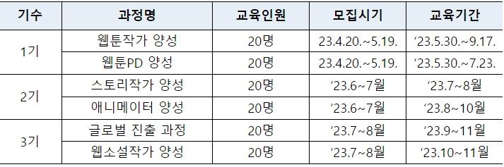 6개 과정(▲ 웹툰작가 양성 ▲ 웹툰PD 양성 ▲ 스토리작가 ▲ 애니메이터 양성 ▲ 글로벌 진출 과정 ▲ 웹소설작가 양성 )은 모두 1:1 코칭, 모의 면접, 기업 매칭 등 취업지원 프로그램이 함께 진행된다.