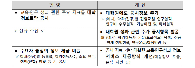 이와 함께 대학원 정원 운용 관련 규제 개선과 연계해 대학원 교육·연구 성과에 대한 정보공개 강화도 함께 추진한다.