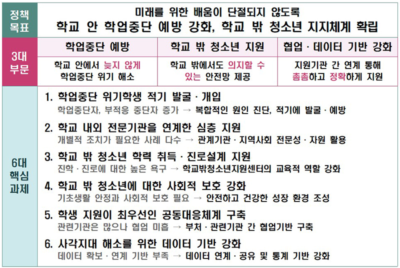 사회부총리를 중심으로 학업중단 예방 및 학교 밖 청소년 지원에 관한 관계부처 협력을 강화하고, 학업중단 학생 정보가 적기에 연계될 수 있도록 법적 기반을 마련한다.