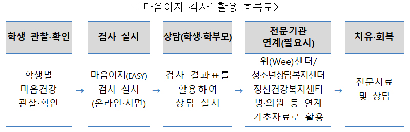 마음이지 검사 배포에 따라 3년 주기로 정해진 학년에만 검사를 실시하던 기존의 ‘정서·행동특성검사’와는 별도로, 학교가 필요하다고 판단하는 경우 앞으로 언제든지 학생에 대한 마음건강 진단을 실시할 수 있게 된다.