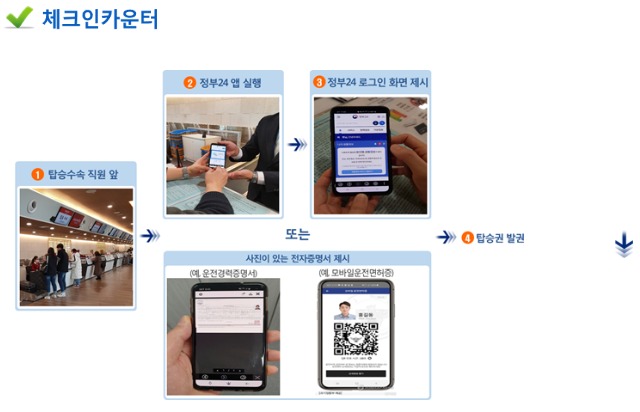 신분증을 미소지한 국내선 항공기 승객은 탑승권 발권 및 검색장 진입 시 탑승수속 직원 및 보안요원에게 승객 본인 스마트폰으로 정부24 앱을 실행한 후 로그인하는 절차를 보여주면 된다.