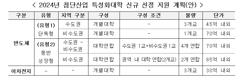 반도체 특성화대학으로 수도권 7곳·비수도권 3곳 등 모두 10곳(또는 연합)을 선정해 모두 655억 원을 지원하고, 이차전지 특성화대학은 3곳을 선정해 90억 원을 지원한다.