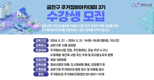 금천구는 주거정비지원센터 주관으로 구청 대강당에서 오는 5월 27일부터 31일까지 '주거정비아카데미'를 운영한다고 밝혔다.