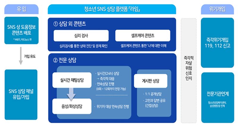 마음 건강을 관리하고 위기 학생을 지원하는 학생 상담 채널 ‘라임(LIME)’이 운영된다. 모바일 기반의 24시간 상담 채널로, 9세부터 24세까지 청소년을 대상으로 전문적인 심리 상담을 지원한다.