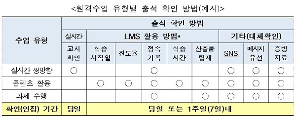 콘텐츠를 활용한 수업의 경우에는 학습관리시스템(LMS)을 활용해 학습시작일, 진도율, 학습시간 등을 기준으로 출석을 체크한다.