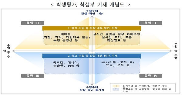 다만 원격수업 중에 교사가 학생의 학습 과정과 결과를 직접 관찰할 수 있는 경우 이를 토대로 평가하거나 학교생활기록부에 기재할 수 있도록 했다. 실시간 쌍방향 수업시 실시한 토의, 토론에서 학생의 참여도나 논리성을 등을 평가해 학생부에 기재하는 식이다.