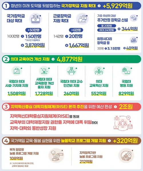먼저 국가장학금은 청년의 학자금 부담을 경감해 미래도약을 뒷받침하기 위해 I유형 및 다자녀 장학금 지원 대상 확대해 3878억 원을 증액했다.