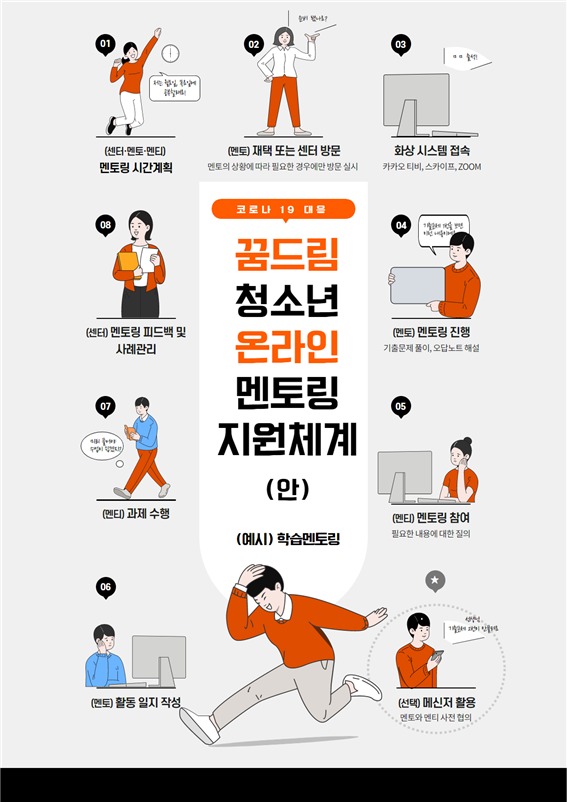 멘토링 서비스를 원하는 청소년은 인터넷 화상회의 프로그램 줌(zoom), 카카오TV 등을 통해 검정고시, 진로, 성장고민 등에 대한 멘토링을 받을 수 있다.