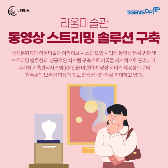 삼성문화재단 리움미술관 아카이브시스템 스트리밍솔루션 도입 사업은 조직의 핵심 정보자산인 기록을 체계적으로 관리하고, 디지털 기록관리시스템(RMS)을 구축해 기록 관리 기능을 강화하는 목적을 갖고 있다. 이를 위해 하드웨어 및 소프트웨어 도입, 전사적 기록 생애주기 관리, 시스템 접근 권한 관리, 원문검색, 시청각 기록물 관리, 동영상 스트리밍, 통합인증 및 내부 시스템 연계, 기록물 이관, 기록물 분류체계 수립, AI OCR 기반 검색, 개인화 서비스 등이 포함됐다. 이를 통해 기록물의 보존성을 향상시키고, 업무 생산성을 증대시키며, 정보 활용성을 극대화하고, 무결성과 신뢰성을 확보하며, 이용 편의성을 제고할 것으로 기대된다.