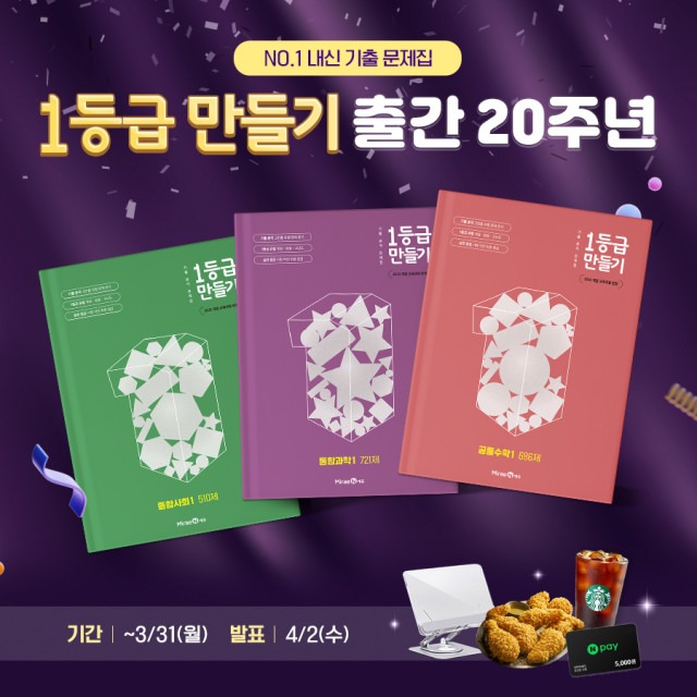 미래엔은 ‘1등급 만들기’ 시리즈 20주년을 맞아 다양한 온라인 이벤트를 진행한다. 3월 31일까지 네이버 카페 ‘기출비’와 ‘성공운’에서 댓글 및 소식 공유 이벤트를 진행하며, 추첨을 통해 독서대, 치킨 세트, 스타벅스 커피 쿠폰, 네이버페이 5000원권 등을 증정한다.