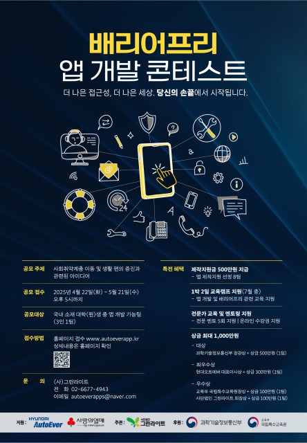 아이디어 모집은 5월 21일(수)까지며, 앱 개발이 가능한 대학(원)생 3인 1팀으로 구성해 배리어프리 앱 개발 콘테스트 홈페이지에서 지원 가능하다. 자세한 내용은 홈페이지(www.autoeverapp.kr)에서 확인할 수 있다.