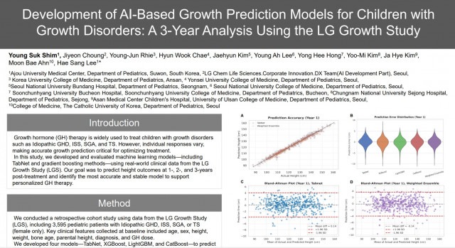 발표자로 나선 아주대 심영석 교수는 “저신장증 환아들의 성장호르몬제 치료 효과를 예상하기 위한 진료 현장의 수요가 지속 커지고 있다”며 “LG화학의 유트로핀 장기안전성 연구(LG Growth Study)를 통해 누적된 대규모의 치료 데이터를 활용해 키 성장 예측 AI 모델을 고도화시켰다”고 말했다.