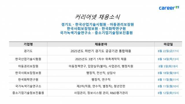 취업 포털 커리어가 경기도, 한국산업기술시험원, 아동권리보장원, 한국사회보장정보원, 한국화학연구원, 국가녹색기술연구소, 중소기업기술정보진흥원 채용 소식을 5일 발표했다.