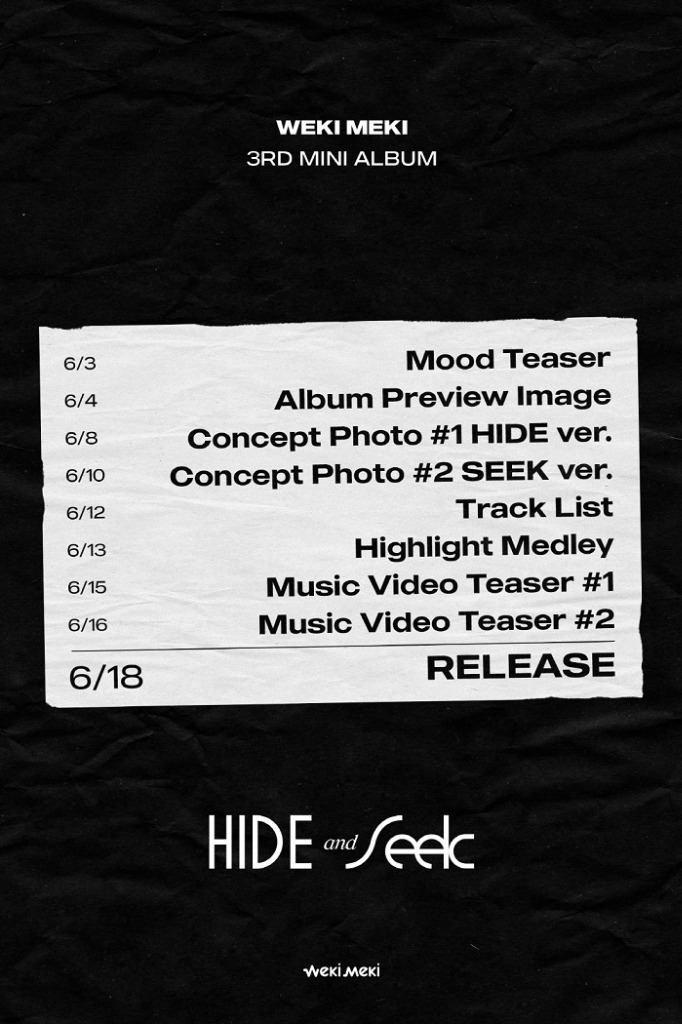 공개된 스케줄러에 따르면 위키미키는 3일 앨범의 분위기를 엿볼 수 있는 무드 티저를 시작으로 4일 앨범 프리뷰, 8일과 10일에는 각각 ‘HIDE’(하이드)와 ‘SEEK’(식) 버전의 콘셉트 포토를 공개한다. 또한 12일 트랙 리스트, 13일 하이라이트 메들리에 이어 15일과 16일에는 두 편의 뮤직비디오 티저를 순차적으로 오픈해 컴백에 대한 열기를 높일 예정이다.