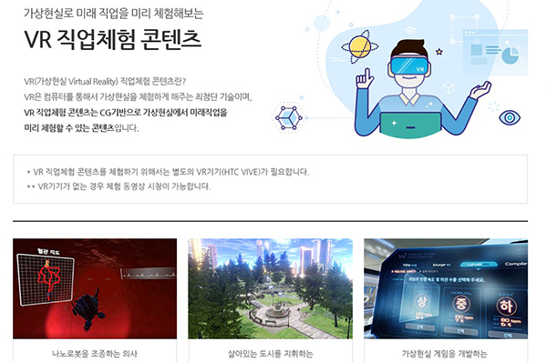 한편 고용정보원에서는 2017년부터 청소년이 가상현실(VR)에서 미래직업 주요 업무를 직접 경험해볼 수 있는 콘텐츠를 개발해 각종 박람회와 한국잡월드에서 활용하도록 하고 있다.
