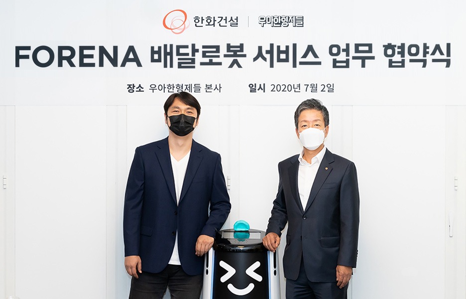 한화건설(대표이사 최광호)은 7월 2일 송파구 방이동 우아한형제들 사옥에서 ‘FORENA(포레나) 배달로봇 서비스 업무협약’(MOU)를 체결했다고 밝혔다.