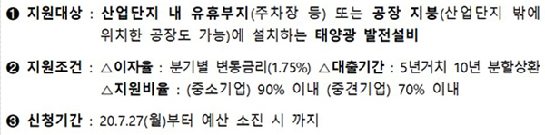 이번 산업단지 태양광 금융지원사업의 지원대상은 산단 유휴부지 또는 공장 지붕을 활용한 태양광 발전사업을 희망하는 공장주나 해당 대상지 임차인 등이다.