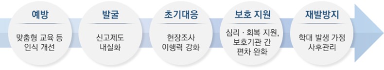 발굴단계에는 신고의무자 직군을 위한 전문 교육 콘텐츠를 개발·보급하고, 교원·보호시설 종사자에게 익명 신고·신고자 보호제도를 집중 안내한다.