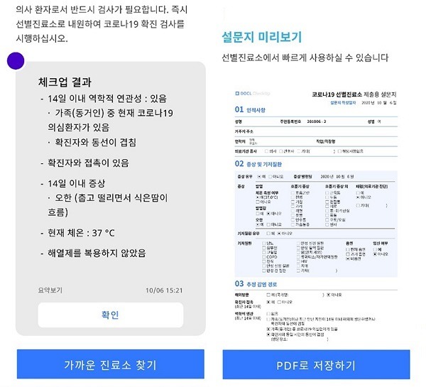 미확진자용 서비스(https://docl.org)는 코로나19 바이러스 감염이 의심스러울 때 자신의 증상을 앱에 입력하면 선별진료소 방문 필요여부 및 대처방안을 안내해준다. 앱을 통해 입력한 데이터와 결과는 PDF 파일로 전송과 출력이 가능해 선별진료소 방문시 진료시간을 단축할 수 있는 장점이 있다.