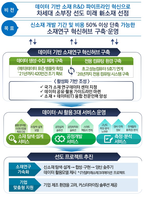 아울러 소재연구 가속화 선도 프로젝트도 추진한다. 소재연구 혁신허브 및 3대 서비스를 소재 연구개발 전주기에 활용, 신소재 개발 시간·비용을 절반으로 절감하는 선도사업을 추진한다.