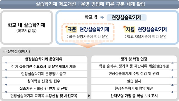 먼저 ‘고등교육법’ 제22조에 따른 현장실습학기제를 ‘표준 현장실습학기제’와 ‘자율 현장실습학기제’로 구분해 체계를 확립하고 ‘표준 현장실습학기제’에 대해서는 운영 기준, 절차 및 양식 등을 표준화해 운영하도록 할 예정이다.