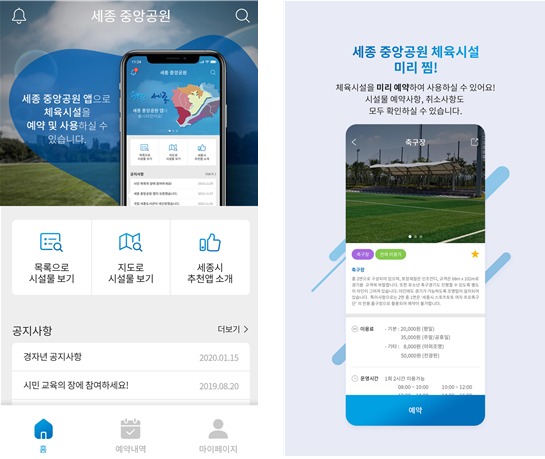 이번 ‘세종 중앙공원’ 앱은 플레이스토어 및 앱스토어를 통해 다운로드 받을 수 있으며, 오는 29일(목) 오전 10시부터 앱 이용자 누구나 세종 중앙공원 체육시설을 예약할 수 있다.